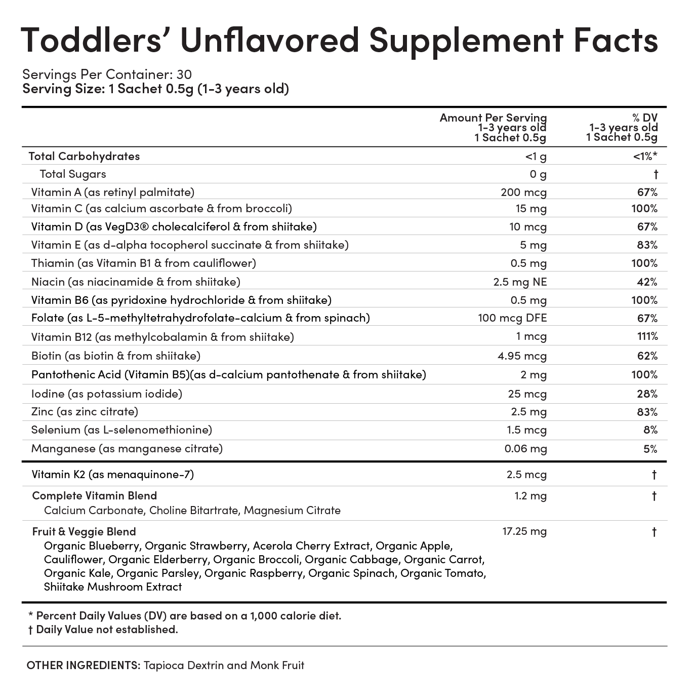 Developed with pediatricians and pediatric dietitians, our Toddlers’ Essential Unflavored Multivitamin and Unflavored Iron with Vitamin C delivers 20+ essential vitamins and minerals in an easy-to-mix, flavorless powder to support healthy growth and development for 2-3 year olds: