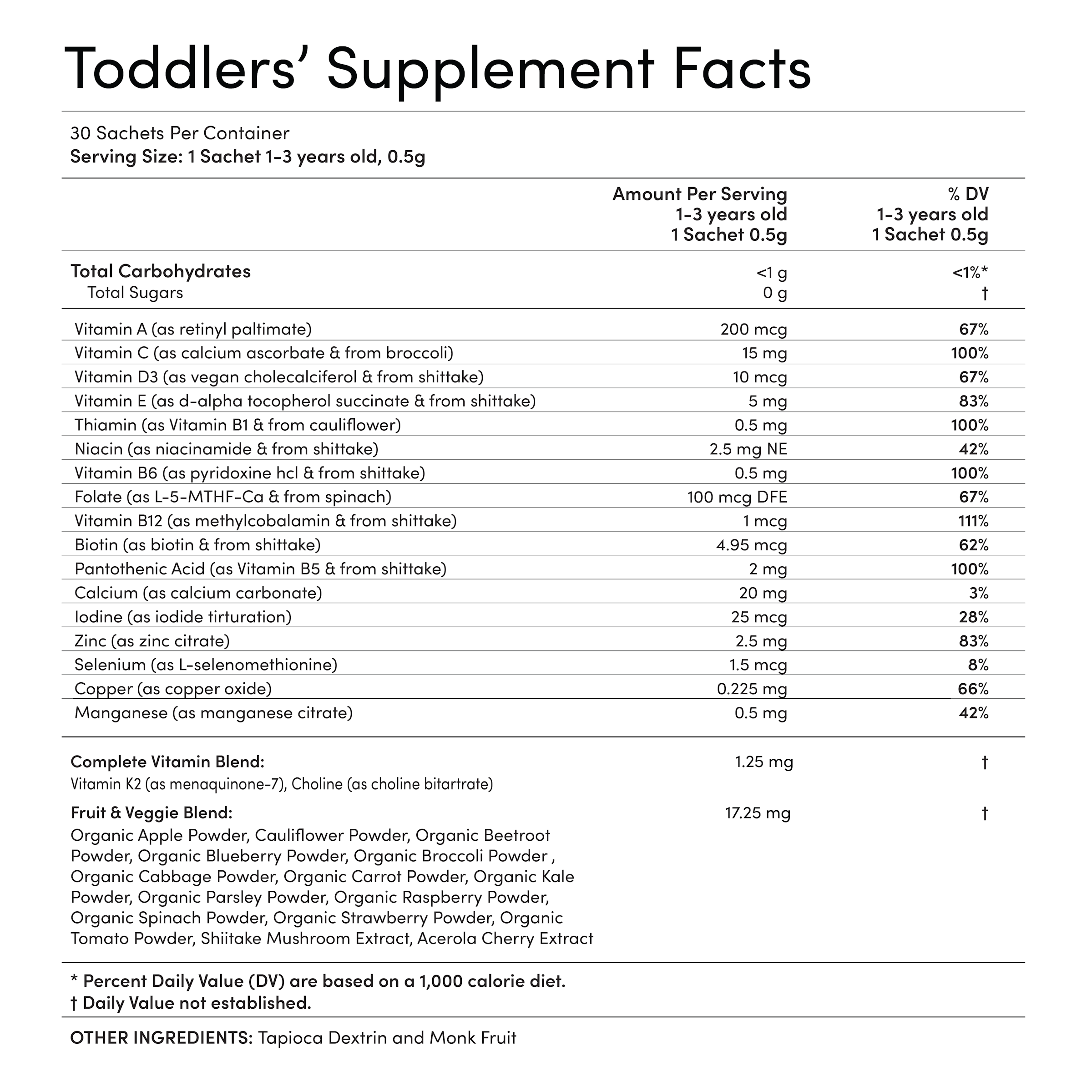 Developed with pediatricians and pediatric dietitians, daily stickpack multivitamin with 19 essential vitamins & minerals to support healthy growth and development for 1-3 year olds: