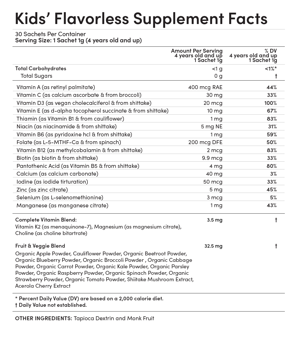 Our innovative powder formulation is incomparable to other products out there provides a complete nutrient panel of 20 vitamins and minerals to help your child with overall growth and development.